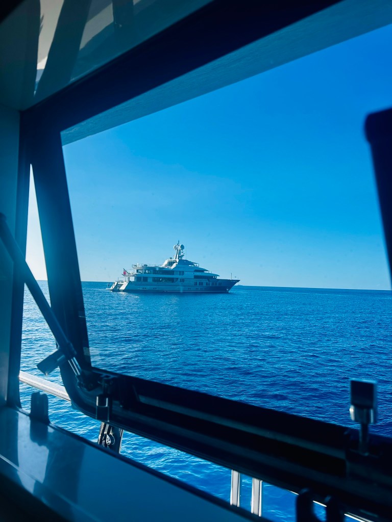 The days dredged on, and the only things that saved me were podcasts, music, and the laughter and connection with my stews. But the most beautiful gift came when we were rounding off the southeastern corner of Sicily and a pod of dolphins showed up to cruise with us. They were smaller in size, grey backed and extremely playful. They jumped and twirled in our wake, putting on a grand show. They stayed with us for probably 15 minutes, moving up to the bow, swimming with expert agility. That gift was the most extraordinary thing I’d ever witnessed at sea.