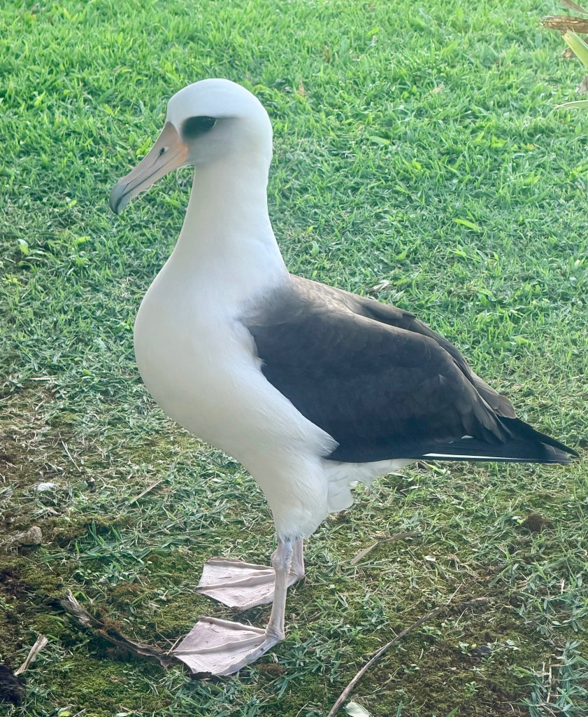 Harmony and I noticed that one family seemed to be a triad. Curious, we looked this anomaly up and learned that researchers had observed Laysan albatrosses forming female couples throughout the island, with an extra-pair male copulator. Basically, there were not enough males around, so to increase their chances of raising a chick, females would “borrow” a mate, both lay eggs, then incubate only one for higher survival. One female stayed with the egg while the other went off for food, then they would switch. Another revelatory mark of the ingenuity of females.